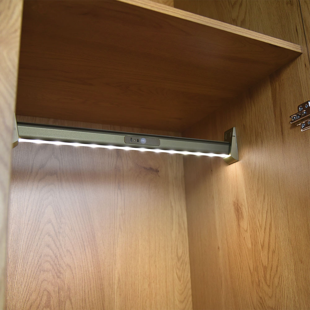 It has two large doors, four large shelves and a hanging rod with LED lights that light up when we open the door to make it easier for us to find the child’s clothes.