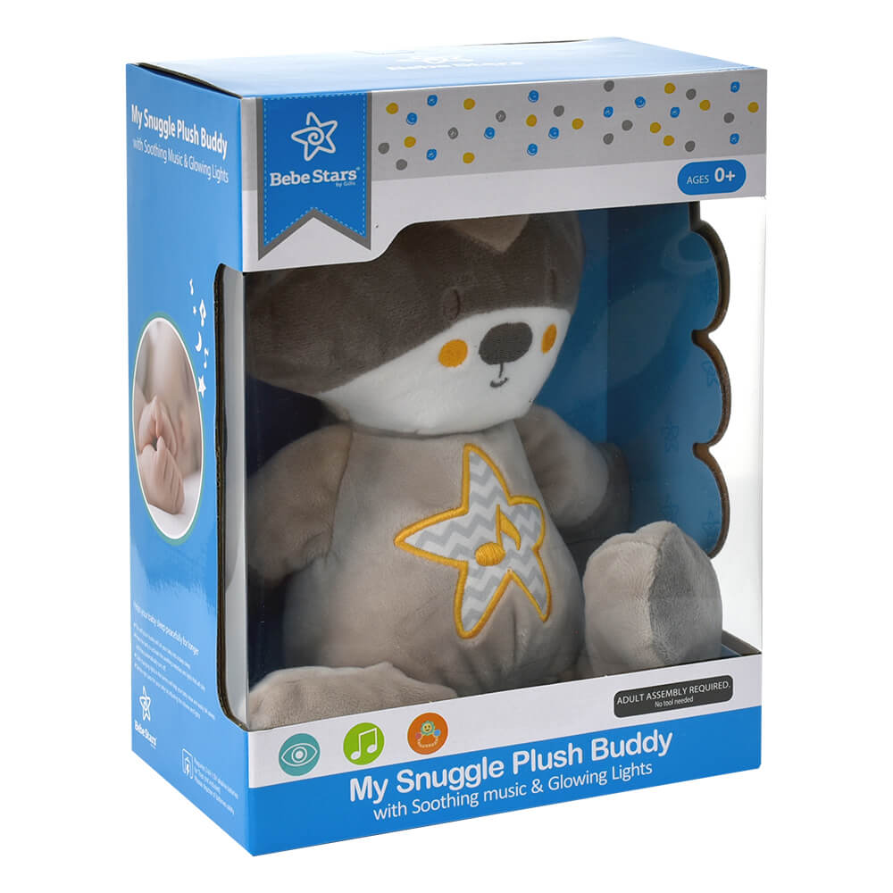 Our little friends can fall asleep with the soothing cuddle Raccoon of Bebe Stars! Hug him and press his belly, the star will light up and the baby will have company in the dark!