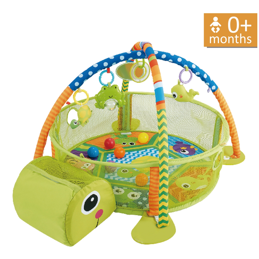 Με 3 τρόπους χρήσης παιχνιδιού. Το βρέφος μπορεί να παίξει στο άνετο χαλί με τα τέσσερα αξιολάτρευτα θαλάσσια ζωάκια που κρέμονται πάνω από το κεφαλάκι του. Καθώς μεγαλώνει και γίνεται δραστήριο, η μαλακή περίφραξη θα το περιβάλλει διατηρώντας το σε ασφαλή ζώνη. Τα μικρά παιδιά μπορούν να καθίσουν και να παίξουν στο πάρκο δραστηριοτήτων που διαθέτει 30 πολύχρωμες μπάλες, οι οποίες μπορούν και να αποθηκευτούν μέσα στο κεφάλι της χελώνας.